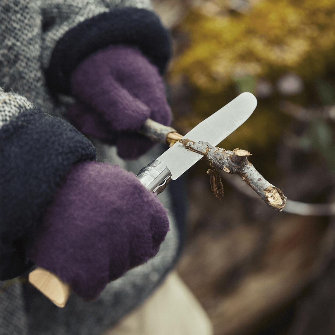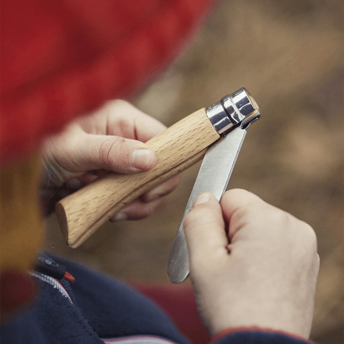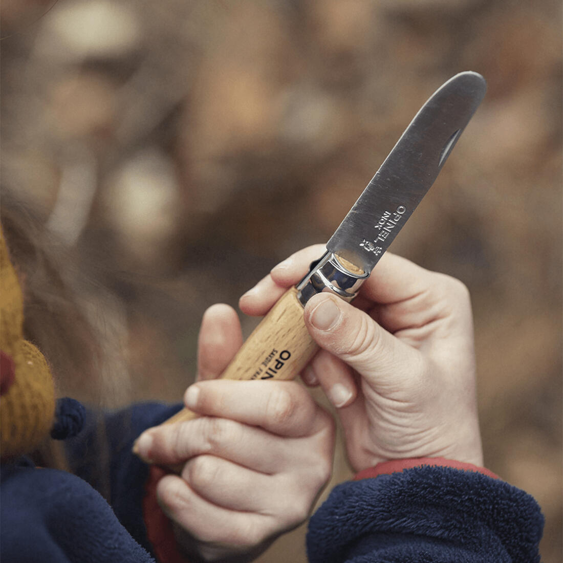 Het kindermes van Opinel met een lemmet in inox (roestvrijstaal) en een handvat in beuk. Met gepatenteerd virobloc-systeem.