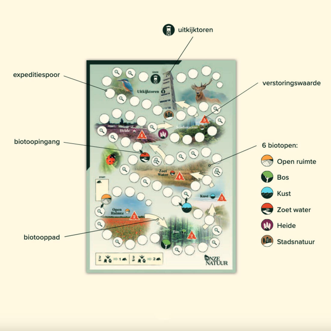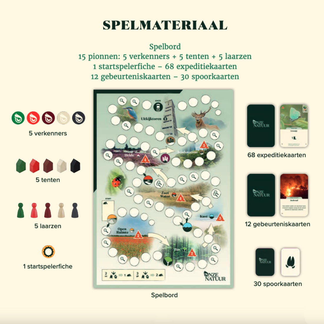 Het ongerepte natuurgebied in dit bordspel telt 6 biotopen waar je tal van inheemse diersoorten kan ontdekken en observeren. Probeer zo snel mogelijk de biotopen te verkennen en de uitkijktoren te bereiken om het spel te winnen. Maar... het leven in Onze Natuur wordt niet graag verstoord. Als je het te bont maakt, kan je expeditie ernstige vertraging oplopen!