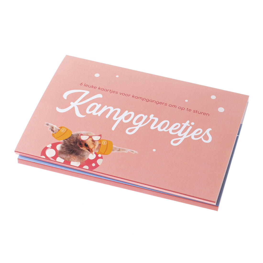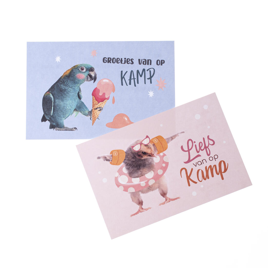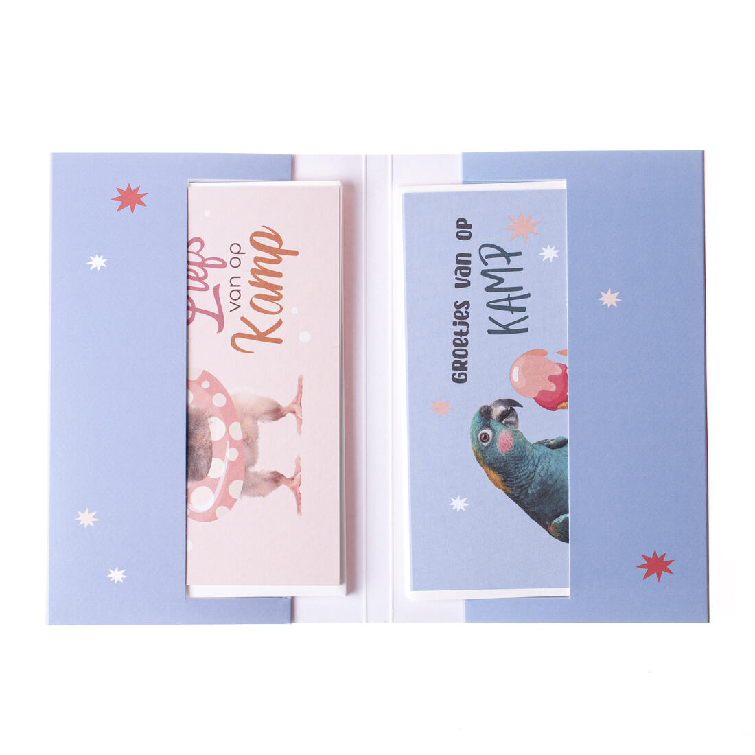 Set van 6 kaartjes met omslag voor de kampgangers om op te sturen naar huis, verpakt in een leuk mapje.