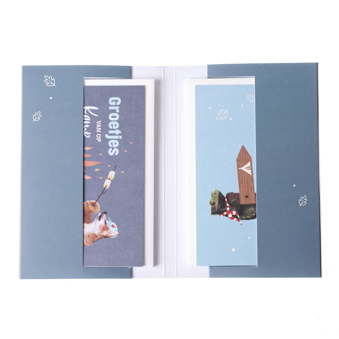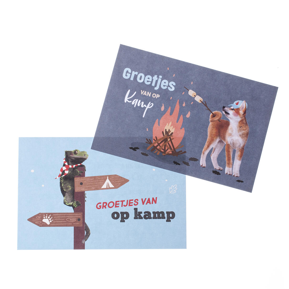 Set van 6 kaartjes met omslag voor de kampgangers om op te sturen naar huis, verpakt in een leuk mapje.
