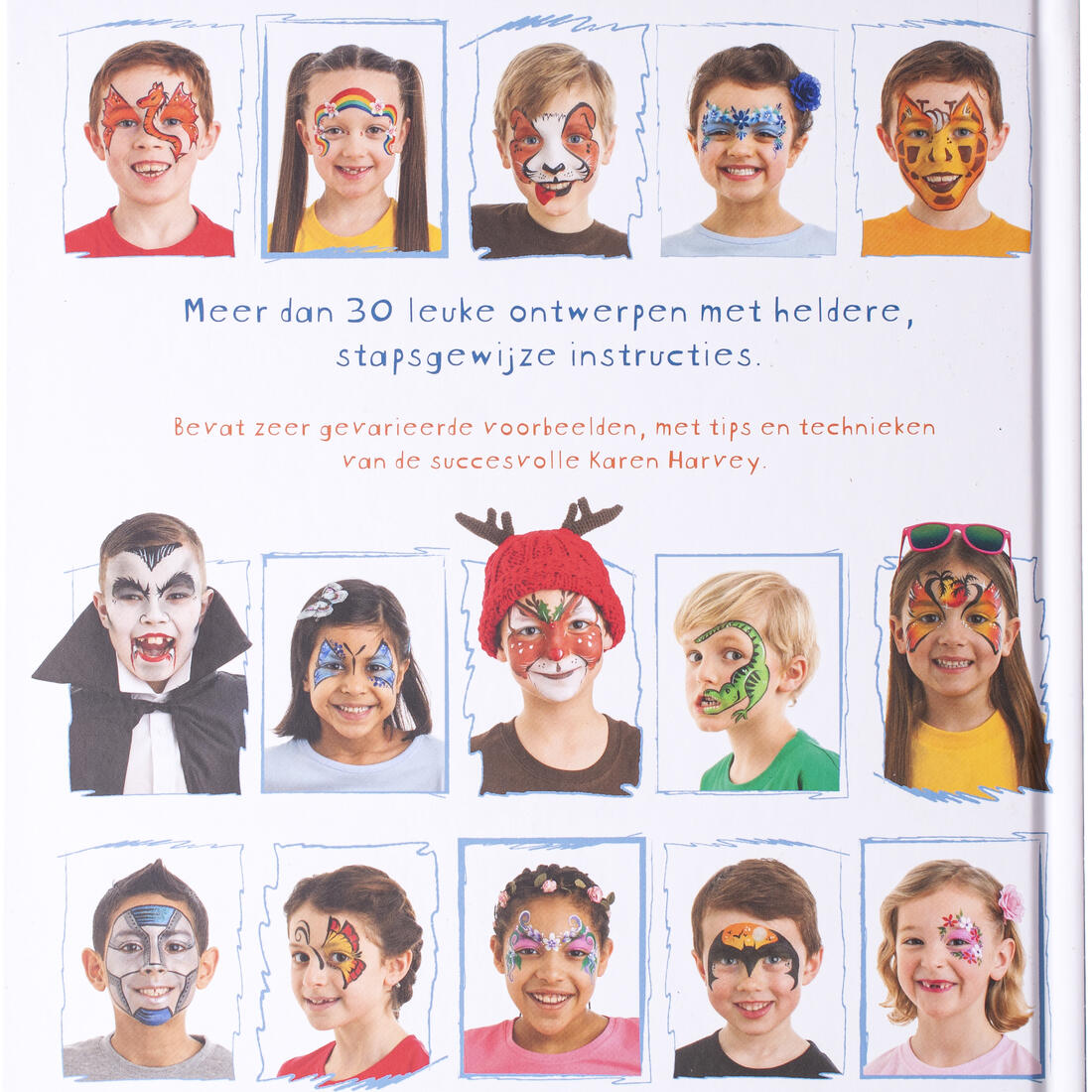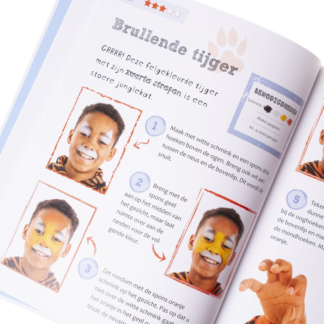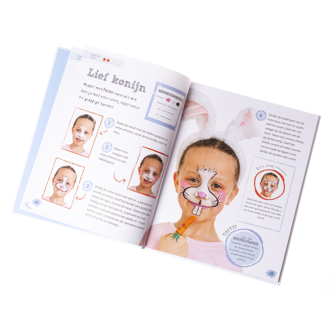 Er is een grote verscheidenheid om uit te kiezen: schmink een giraf of een tijger, een sneeuwkoningin of een bloem, of schrik iedereen af met een enge zombie of gemene heks. Aan de hand van duidelijke foto's wordt het schminkproces stap voor stap uitgelegd.
