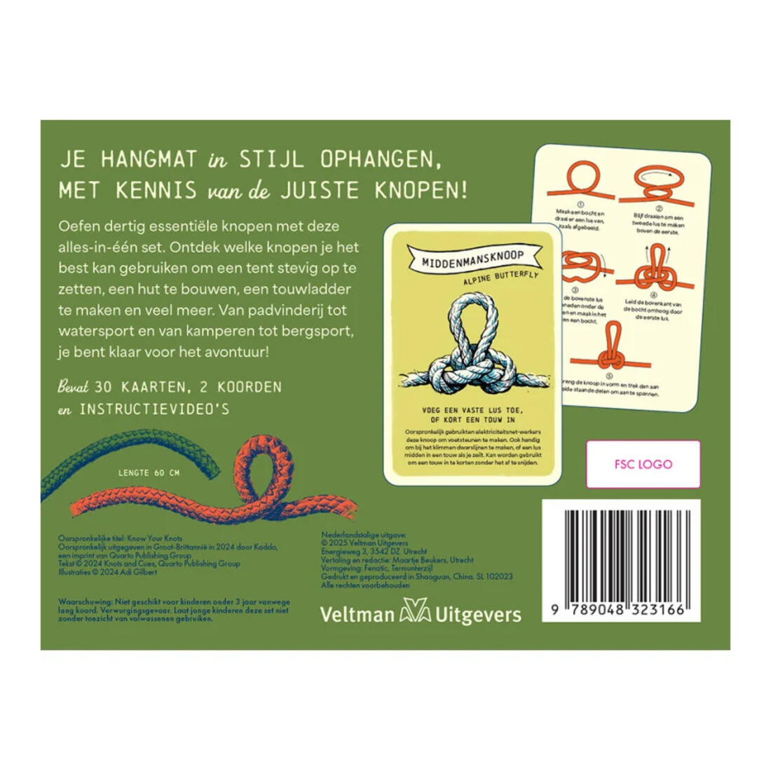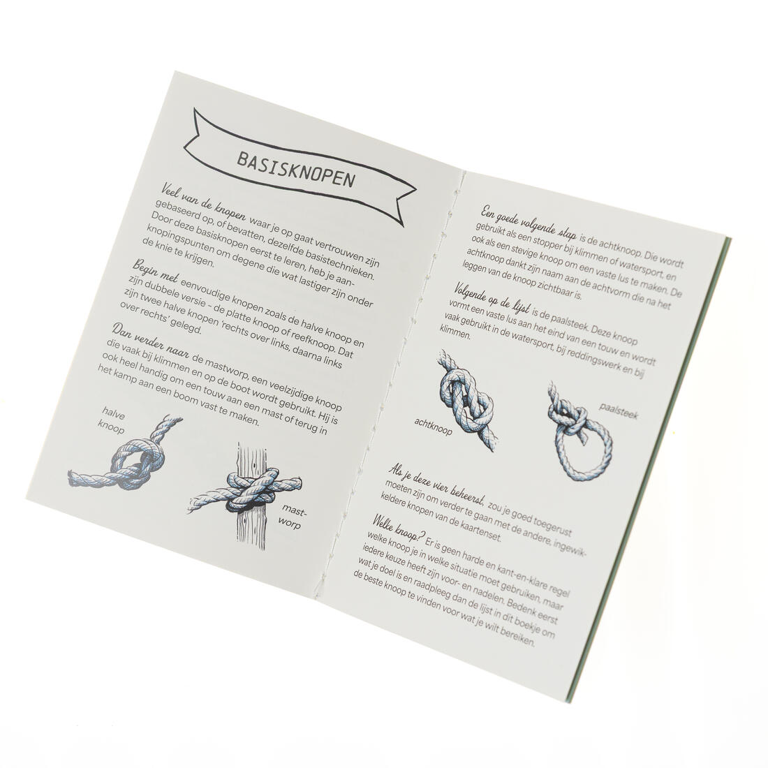 Oefen dertig essentiële knopen met deze alles-in-één set. Ontdek welke knopen je het best kan gebruiken om een tent stevig op te zetten, een hut te bouwen, een touwladder te maken en veel meer. Van padvinderij tot watersport en van kamperen tot bergsport, je bent klaar voor het avontuur!