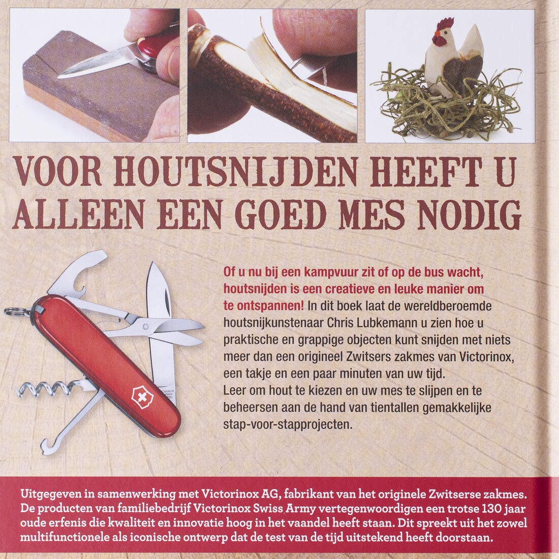Of u nu bij een kampvuur zit of op de bus wacht, houtsnijden is een creatieve en leuke manier om te ontspannen! In dit boek laat de wereldberoemde houtsnijkunstenaar Chris Lubkemann u zien hoe u praktische en grappige objecten kunt snijden met niets meer dan een origineel Zwitsers zakmes van Victorinox, een takje en een paar minuten van uw tijd.