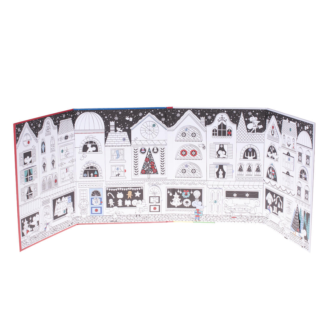 De kalender toont een zwart-wit geïllustreerd straatbeeld, met deuren en ramen om dagelijks te openen en in te kleuren, en veel vriendelijke muizen om te ontdekken.