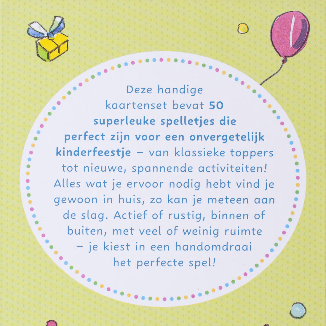 Deze handige kaartenset bevat een verscheidenheid aan spelletjes die perfect zijn voor een zorgeloos kinderfeestje. Van klassieke toppers tot nieuwe, spannende activiteiten. Alles wat je ervoor nodig hebt, vind je gewoon in huis, zo kun je meteen aan de slag. Actief of rustig, binnen of buiten, met veel of weinig ruimte, je kiest in een handomdraai het perfecte spel!