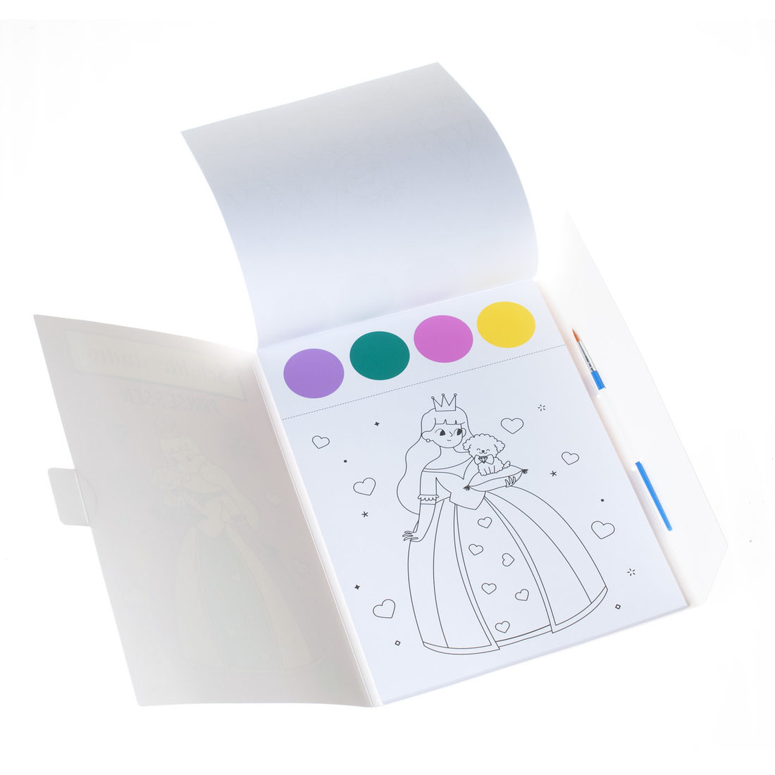 In dit kleur- en schilderboek vind je niet enkel een penseel, maar ook per pagina vier kleuren waterverf terug.