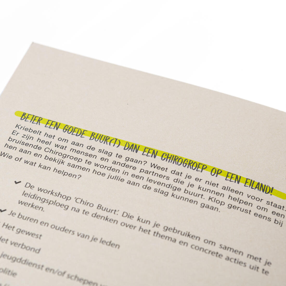 Is jouw Chirogroep een eiland? Ken je jullie buren en omgeving? Kunnen jullie rekenen op steun van de gemeente, ouders, sympathisanten, het jeugdhuis, de bakker en de frituur? Je buurt heeft heel wat te bieden om je Chirogroep sterker te maken. In deze brochure lees je waarom en vooral ook hoe je de band met je buurt kan versterken.