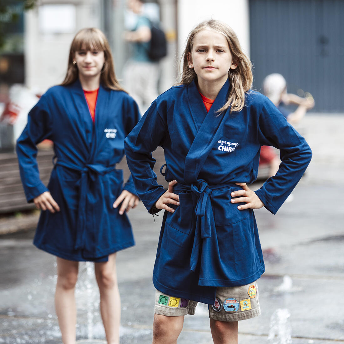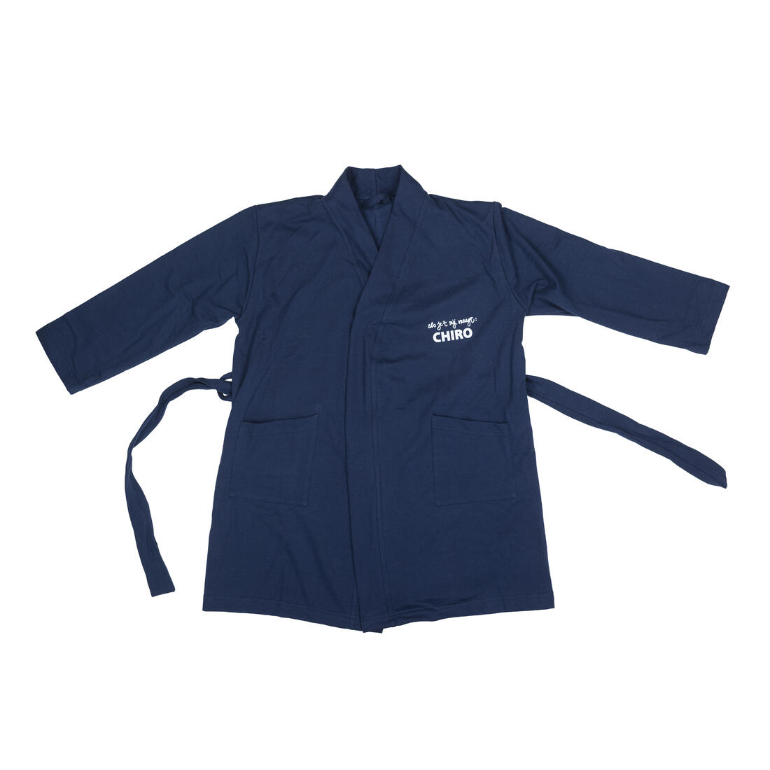 Prachtige blauwe badjas in een lichte stof. De badjas kan gebruikt worden als kamerjas of jas na het zwemmen. Ideaal geschenk voor de echte Chirofan!